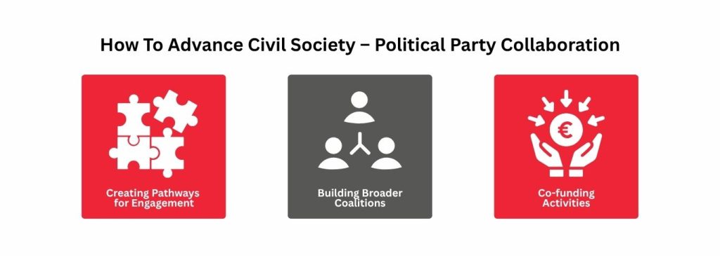 - Political parties can open up their structures to civil society by creating pathways for engagement, including individual associate memberships, organisational affiliations or project-based partnership arrangements.